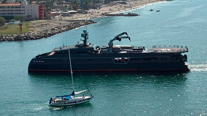 Con sus grúas y estructuras visibles desde el muelle, el ‘Hodor’ reafirma la capacidad de Puerto Vallarta para recibir embarcaciones de ultra lujo y ofrecer servicios a los “juguetes” más sofisticados del planeta.