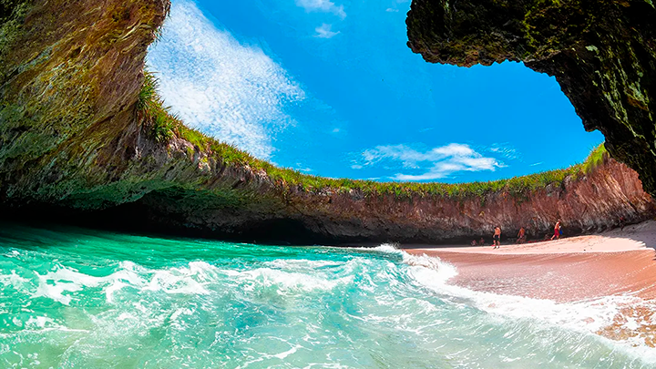 • Playa Escondida (Islas Marietas): Conocida como la Playa del Amor, se encuentra dentro de un cráter natural y solo es accesible nadando a través de una cueva. Es un área protegida, ideal para practicar snorkel, y se recomienda reservar tours con anticipación.