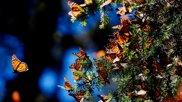 La mariposa Monarca (Danaus plexippus) recorre más de 4,000 kilómetros desde Norteamérica hasta los bosques de oyamel en Michoacán y el Estado de México, donde hiberna. La Reserva de la Biósfera alberga ocho colonias que representan cerca del 70% de la población mundial de esta especie.